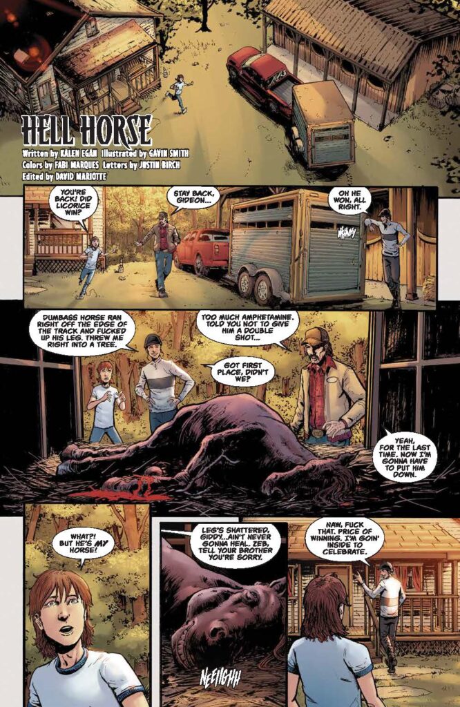 The issue kicks off with “Hell Horse,” a story conceived by writer Kalen Egan and brought to life by artist Gavin Smith. It begins as a gritty tale about a racehorse and a tragic accident but soon spirals into something far grander and more terrifying. Smith’s artwork skillfully conveys the raw emotion of the opening scenes before erupting into fiery, apocalyptic imagery. The plot culminates in the stunning birth of a modern harbinger of the end times, riding forth for “War, Conquest, Famine, Death.”