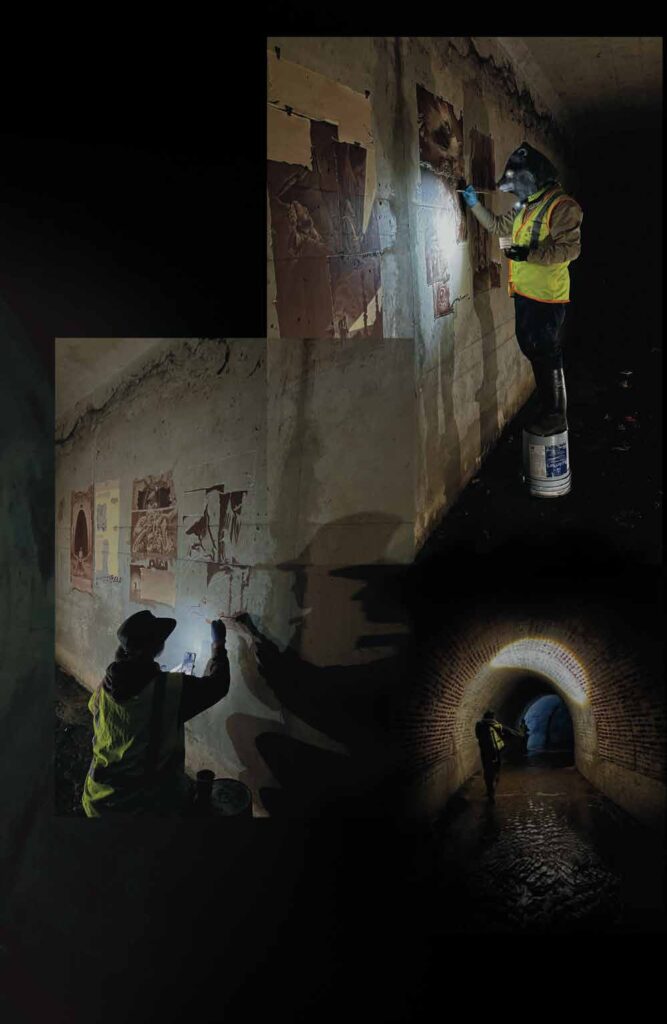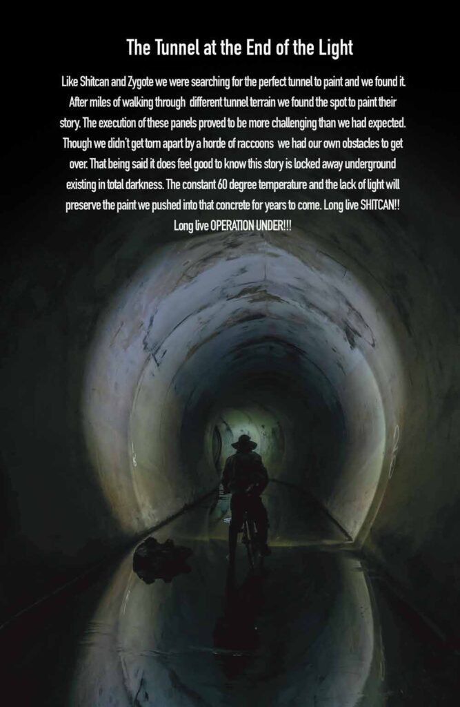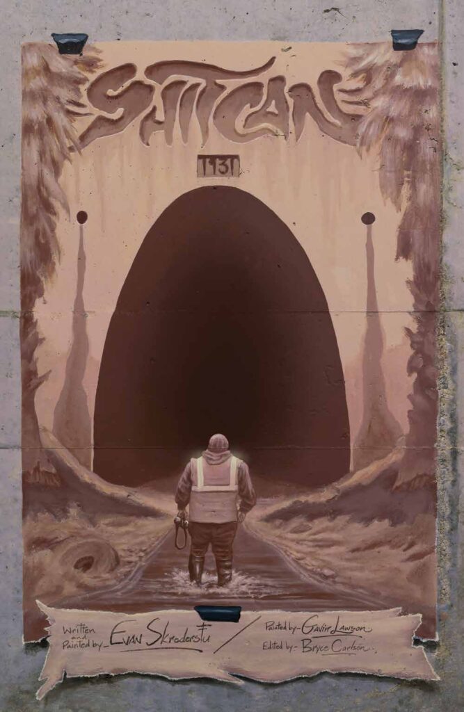 Following that is “Shitcan,” created by Evan Skrederstu and Gavin Lawson. This is the book’s most avant-garde and experimental piece. We follow a graffiti artist on a strange trek through a tunnel, which leads to a surreal and transformative run-in with raccoons. The most intriguing part of this story is revealed afterward: the creators literally painted the comic’s panels inside a real-world storm drain, preserving their art in “total darkness.” This fascinating backstory lends a powerful authenticity to an already bizarre and unforgettable comic. This whole anthology is a great read.