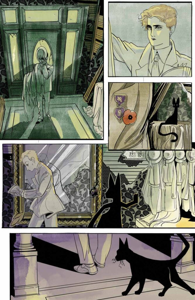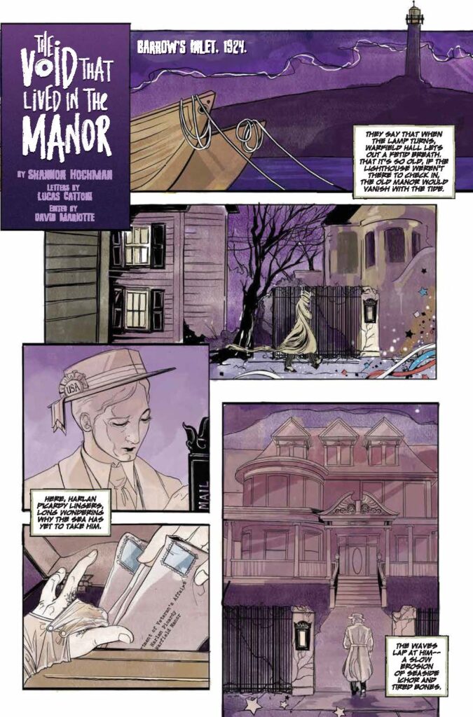 The third entry, “The Void That Lived in the Manor,” is a gothic horror story by Shannon Hochman. Set in the 1920s, it centers on a war veteran languishing in an old house by the sea. His desolate routine is shattered by the appearance of a black cat that is less a feline and more a walking piece of the abyss—a hungry, reality-devouring void. The art style is beautifully haunting, perfectly matching a narrative that dissolves the boundaries between one’s inner demons and literal monsters. The way the creature moves and behaves is profoundly unnerving. The book also features a selection of stunning variant covers that are worth checking out.
