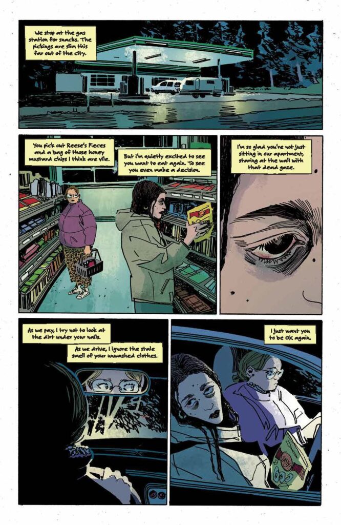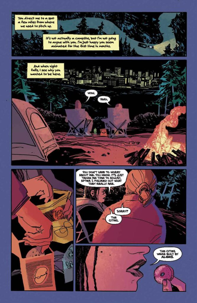 The issue concludes with the spectacular “Gas Station Snacks,” from writer Dan Watters and artist Dani. This story is a triumph of slowly building cosmic horror. A concerned narrator takes their partner, who seems to be in the midst of a mental health crisis, on a camping trip to get away from it all. There, the partner unveils a disturbing belief: our cities are not our own but are immense, living alien entities that consume the endless sound of human civilization. Watters masterfully builds suspense, leaving the reader to wonder if this is a paranoid delusion or an earth-shattering truth. The final pages provide a chilling, large-scale answer that is as awe-inspiring as it is terrifying. It is a fantastic experience.