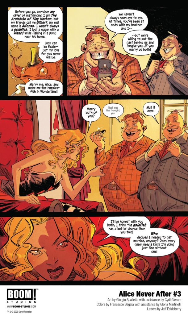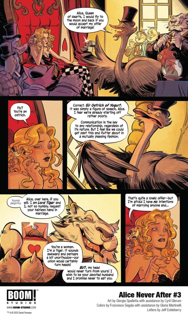 ALICE NEVER AFTER is the newest release from BOOM! Studios’ eponymous imprint, home to critically acclaimed original series, including BRZRKR by Keanu Reeves, Matt Kindt, and Ron Garney; Something is Killing the Children by James Tynion IV and Werther Dell’Edera; Once & Future by Kieron Gillen and Dan Mora; Wynd by James Tynion IV and Michael Dialynas; Grim by Stephanie Phillips and Flaviano; Briar by Christopher Cantwell and Germán García; Stuff of Nightmares by R.L. Stine and A.L. Kaplan; The Approach by Jeremy Haun, Jason A. Hurley, and Jesus Hervas; Damn Them All by Simon Spurrier and Charlie Adlard; BeholdBehemoth by Tate Brombal and Nick Robles; Once Upon a Time at the End of the World by Jason Aaron, Alexandre Tefenkgi, Leila del Duca, and Nick Dragotta; Know Your Station by Sarah Gailey and Liana Kangas; A Vicious Circle by Mattson Tomlin and Lee Bermejo; Mosely by Rob Guillory and Sam Lotfi; Harrower by Justin Jordan and Brahm Revel; The Neighbors by Jude Ellison S. Doyle and Letizia Cadonici; The Seasons Have Teeth by Dan Watters and Sebastián Cabrol; Ghostlore by Cullen Bunn and Leomacs; Sirens of the City by Joanne Starer and Khary Randolph; and the upcoming Rare Flavours by Ram V and Filipe Andrade. The imprint also publishes popular licensed properties, including Dune: House Harkonnen from Brian Herbert, Kevin J. Anderson, and Michael Shelfer; Mighty Morphin Power Rangers from Melissa Flores and Simona Di Gianfelice; Magic from Jed McKay, Rich Douek, and Ig Guara; and The Expanse: Dragon Tooth by Andy Diggle and Rubine.