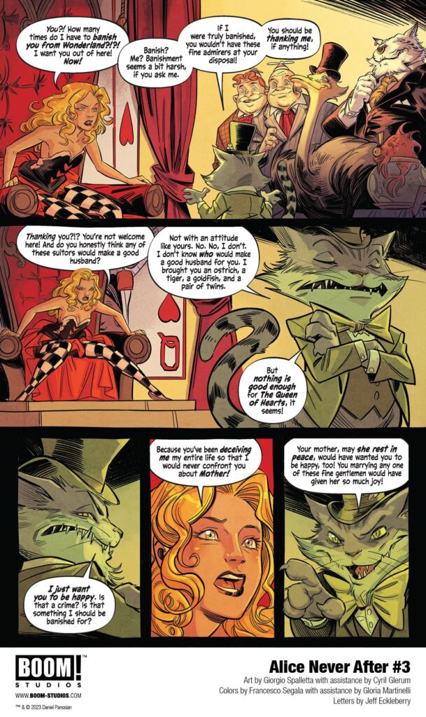 Alice is primed to bring new life into Wonderland… meanwhile, a familiar smile returns to watch her every move. And just as Alice becomes overwhelmed by suitors and nearly ready to leave Wonderland behind, Edith discovers something that may help Alice escape–forever!