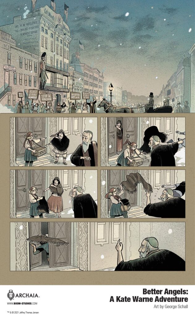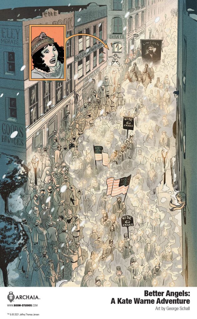 BOOM! Studios today announced a brand new original graphic novel BETTER ANGELS: A KATE WARNE ADVENTURE, from Emmy and Eisner Award-winning writer Jeff Jensen (HBO’s Watchmen, Green River Killer: A True Detective Story) and acclaimed artist George Schall (Made In Korea), inspired by the true story of Kate Warne, America’s first female detective, and her singular achievement—thwarting a plot by Confederate radicals to kill Abraham Lincoln.