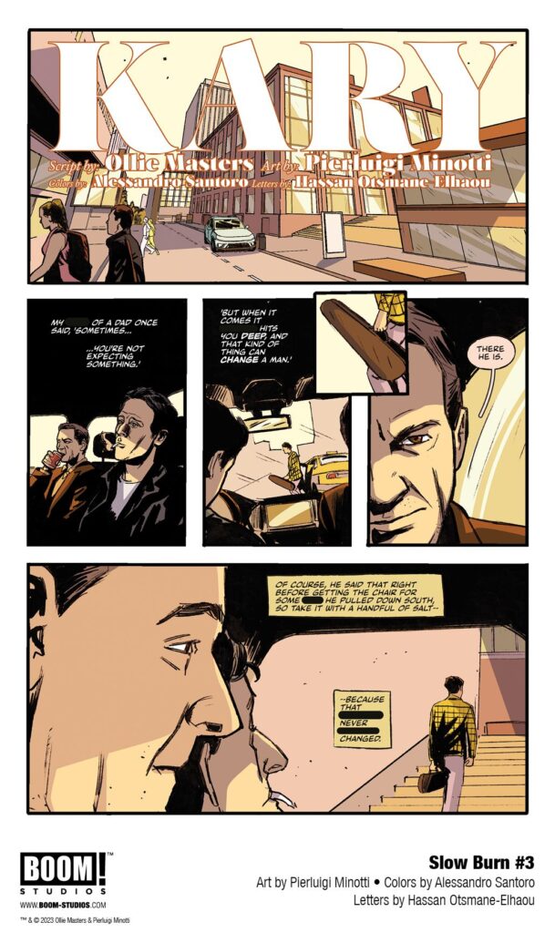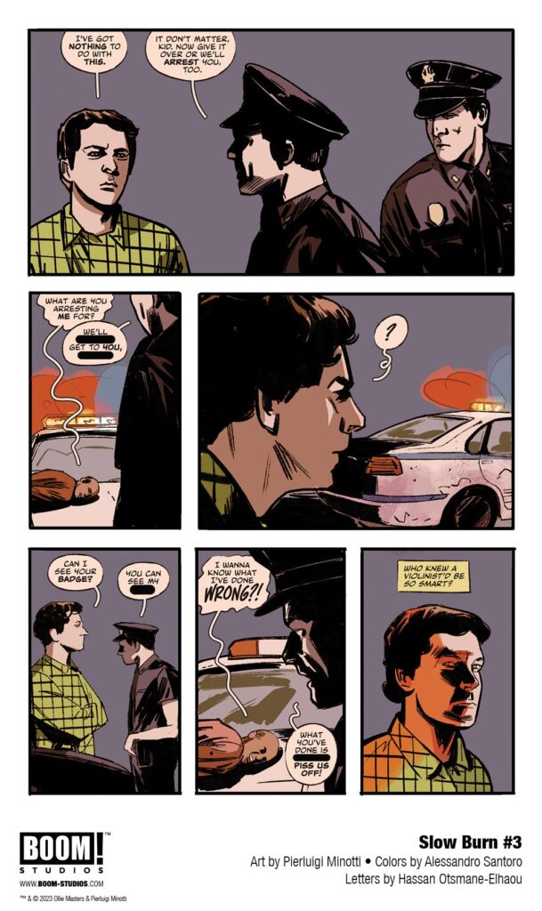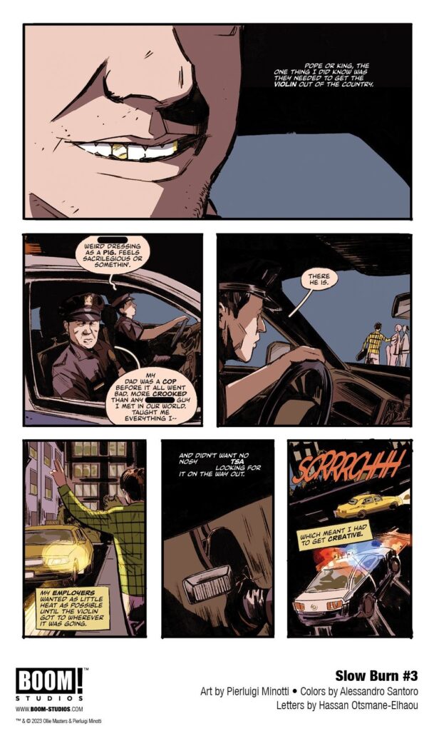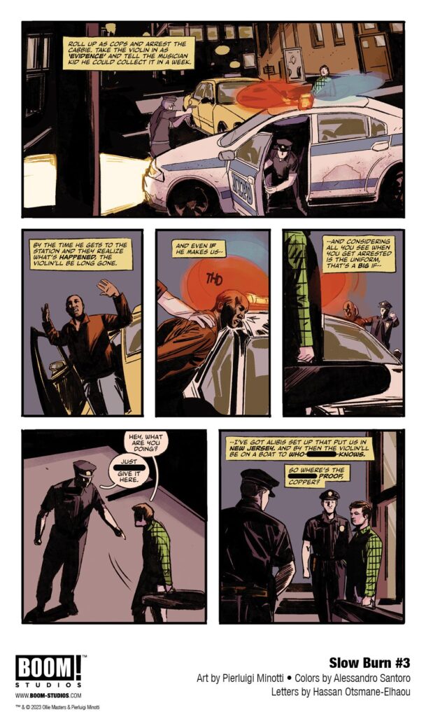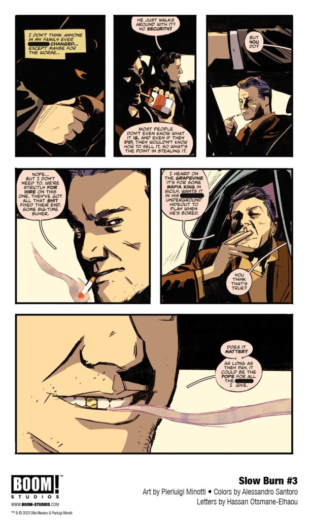 SLOW BURN #3, the next issue of the brand new series from acclaimed noir crime writer Ollie Masters (Snow Blind), rising star artist Pierluigi Minotti (Lost Falls), colorist Alessandro Santoro, and letterer Hassan Otsmane-Elhaou, a tale about dirty deeds in a town on fire, available December 2023.